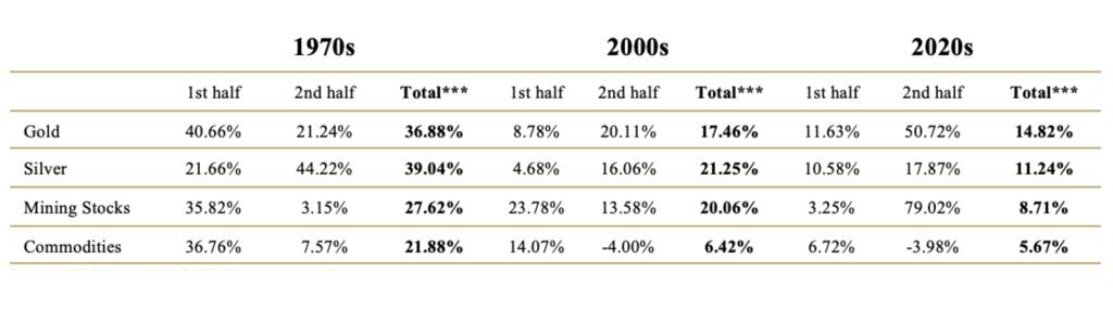 黄金矿业股被视为金价的高波动杠杆变体。1970年代前半期矿业股年涨幅超过35%,但后半期动能减弱。2000年代前半期同样表现更强,年涨幅近24%。2020年代似乎打破了这一模式:前半期表现令人失望,年均涨幅仅3.25%,但后半期迄今年化涨幅近80%,呈现强劲复苏。